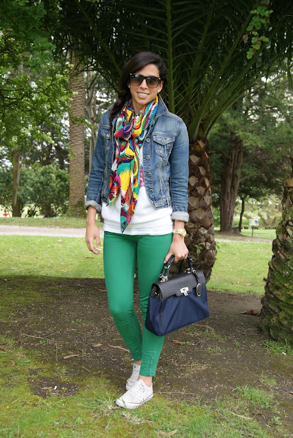 I finally got my denim jacket is a garment which I don't wear out until October, synonymous of good weather. Despite the sporty style of the converse and sweatshirt, I decided to combine it with green pants and colorful scarf. Such blends reflect much my style.